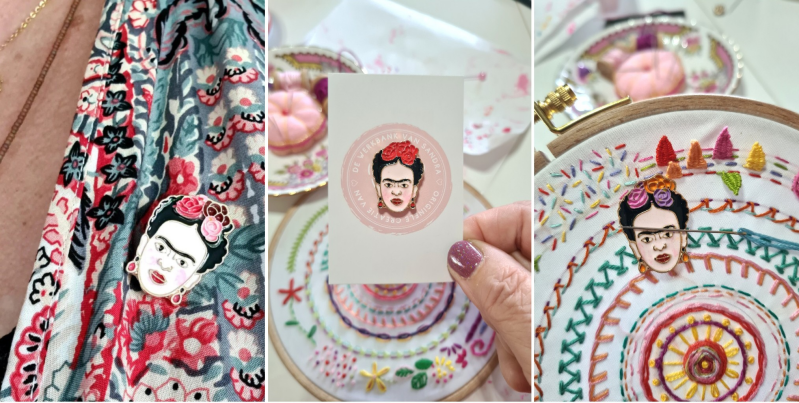 De Frida Pin voor inspirerende vrouwen. Leuk op een kledingstuk maar ook super op een tas of etui. Ook heb ik een versie gemaakt met een goede magneet. Deze Frida’s Attraction is een naaldenmagneet, ideaal om je naalden op je borduurwerk bij de hand te hebben zonder ze in de stof te hoeven steken. Doordat het een goede stevige magneet is kun je deze ook op je kleding als broche gebruiken en natuurlijk op metalen ondergronden.