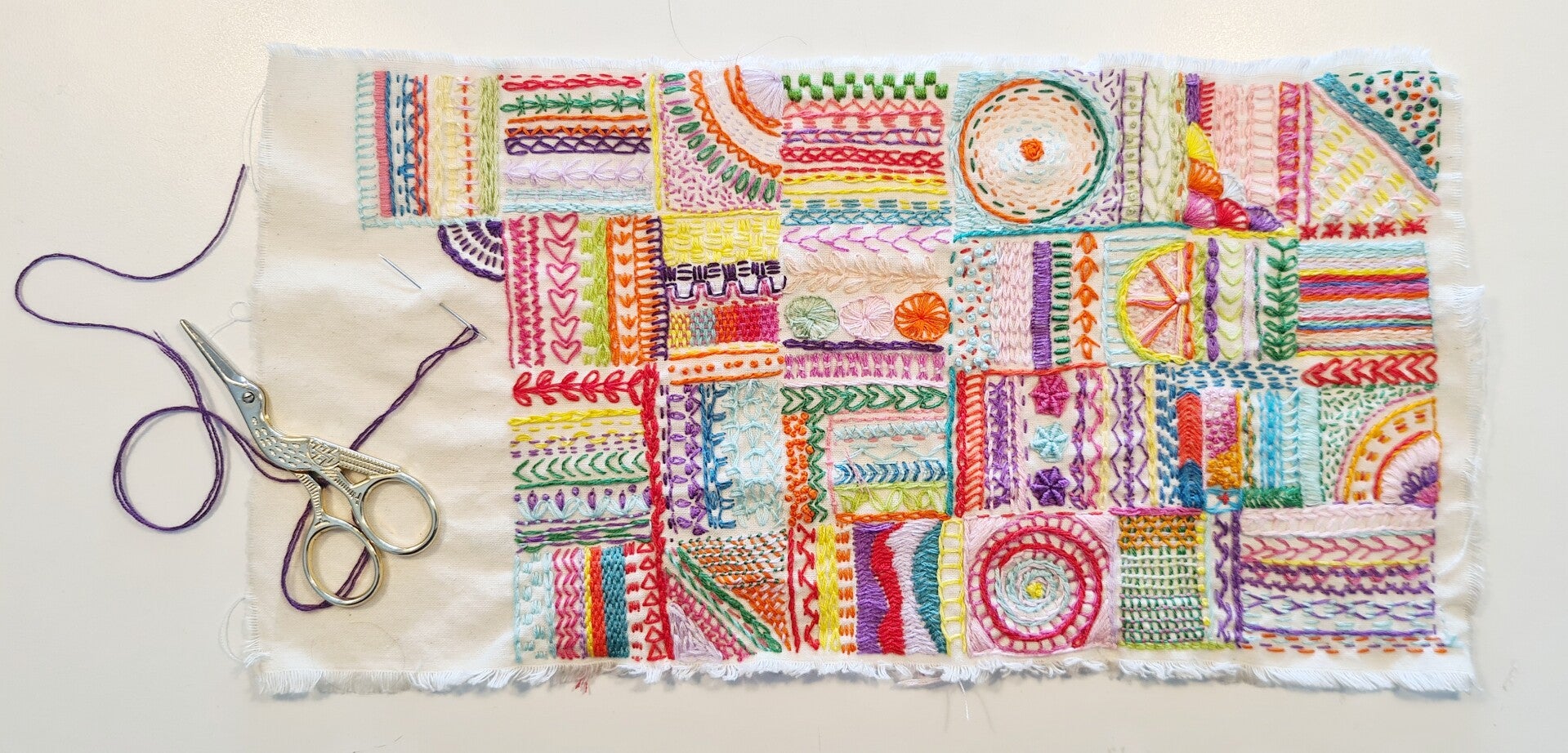 Ik breng allerlei ontwerpen en voorbeeldjes mee. Je leert verschillende borduursteken, hoe je een patroontje overneemt op de stof, compositie en kleurgebruik en netjes aan- en afhechten. En als je wilt help ik je bij het starten van een groter ontwerp dat je thuis borduurt.
