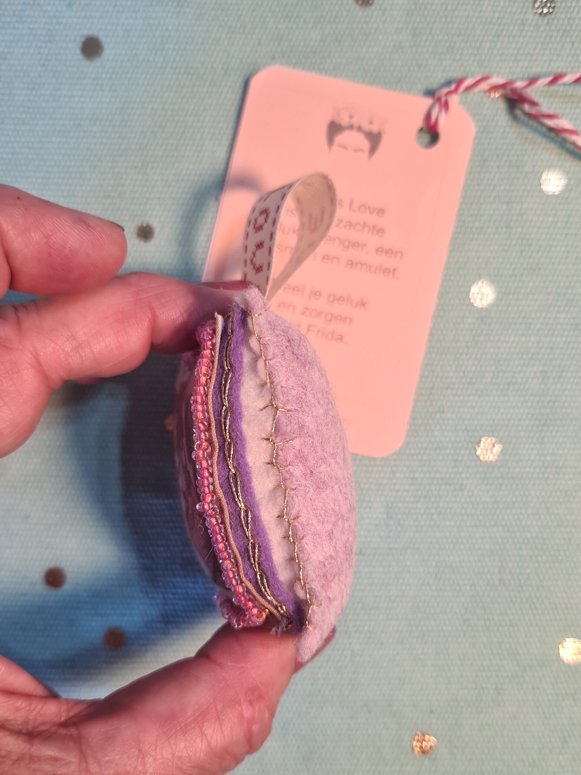 De geluksbrenger heb ik met de hand geborduurd en genaaid met gouddraad en kralen op verschillende kleuren vilt met en een lekker zachte vulling.