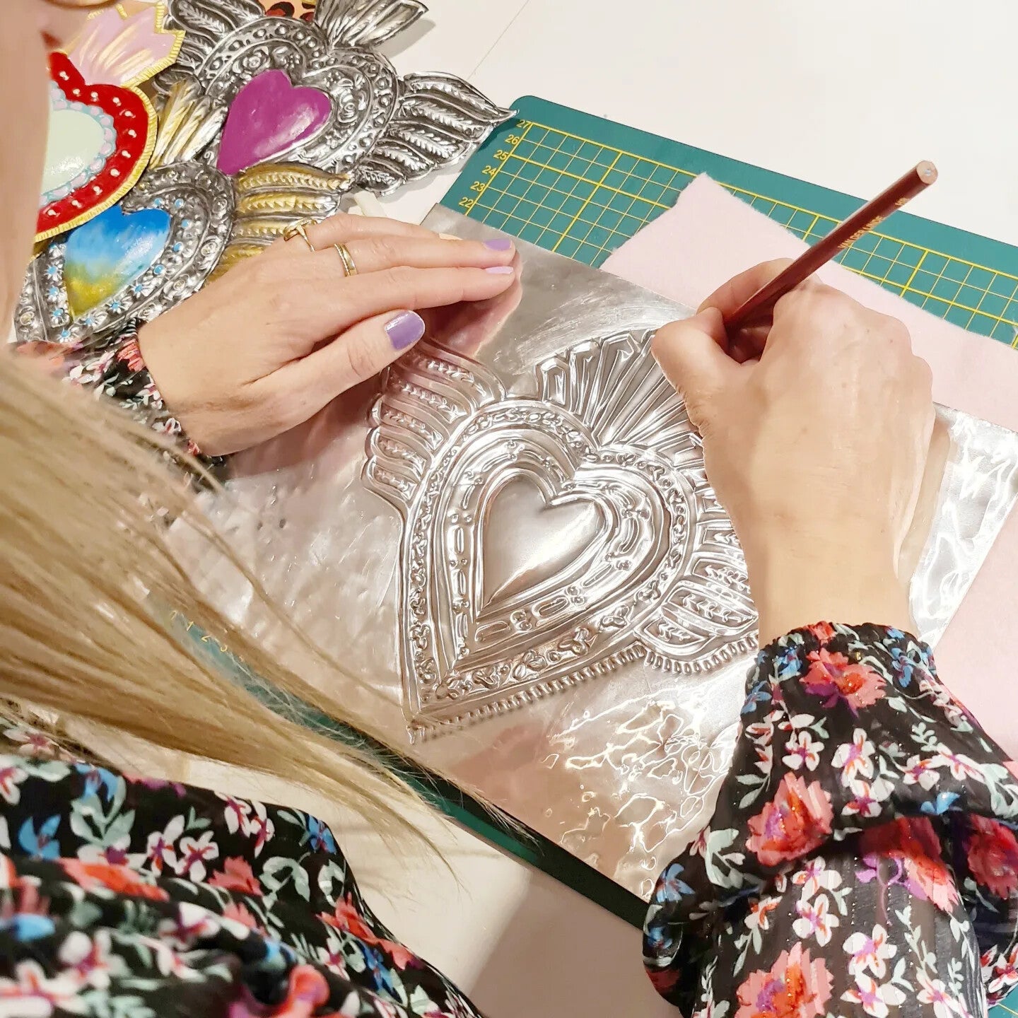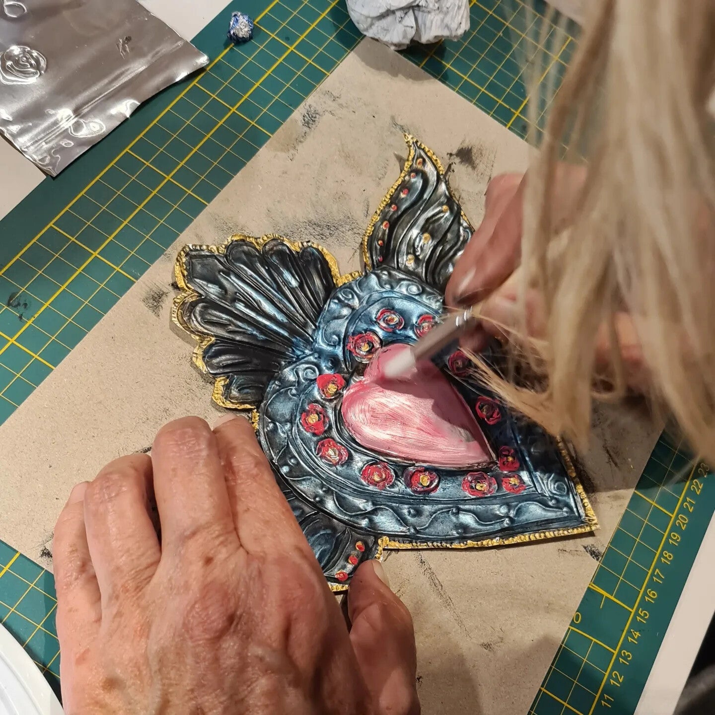 Je kiest één van de ontwerpen die ik voor je meebreng. In de workshop leg ik de techniek stap voor stap uit en kun je één hart of andere vorm maken en decoreren. De harten maak je met de hand met eenvoudige tools zonder mal of stencil maar wel met een uitgetekend patroon. Zo ga je eerst het patroon overnemen, dan het relief aanbrengen in het metaal en als laatste decoreren.Voor het decoreren gebruiken acrylverf. Ook een vorm creëren met een spiegeltje en versieren met kralen is mogelijk.