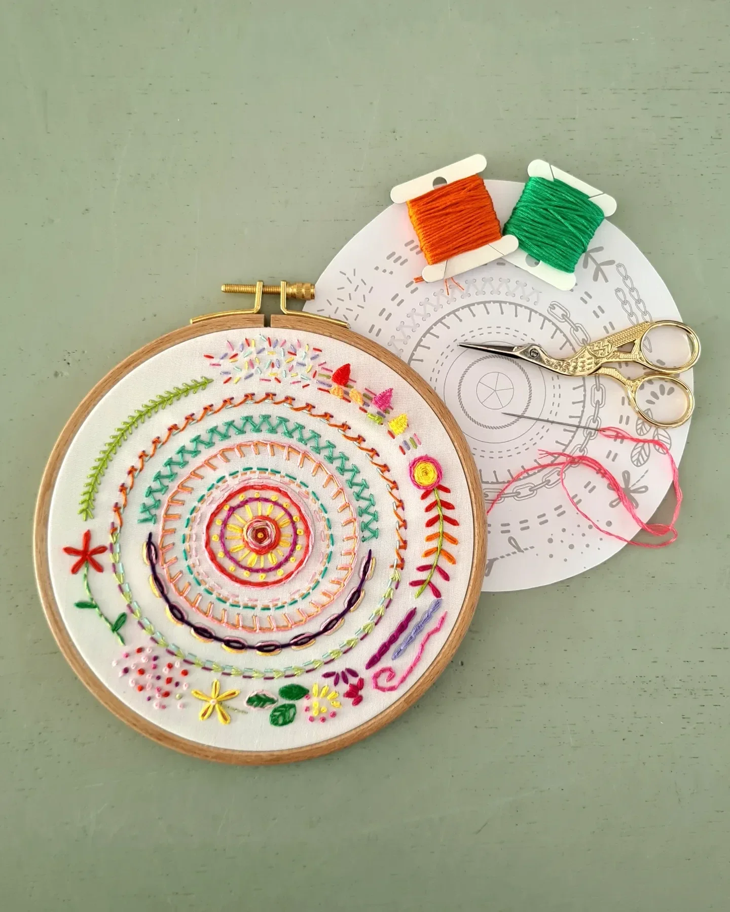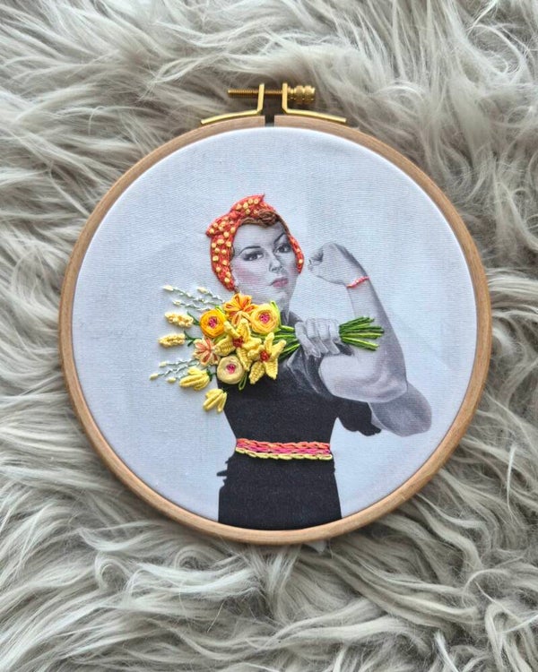 In deze workshop borduur je een kleurrijk boeket bloemen op een afbeelding in zwart/wit van Rosie the Riveter. Je kunt verschillende borduursteken oefenen op de borduurmandala die ik heb ontworpen.