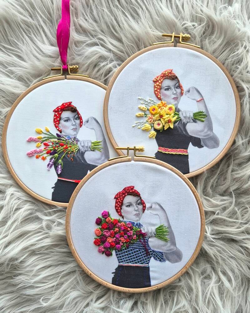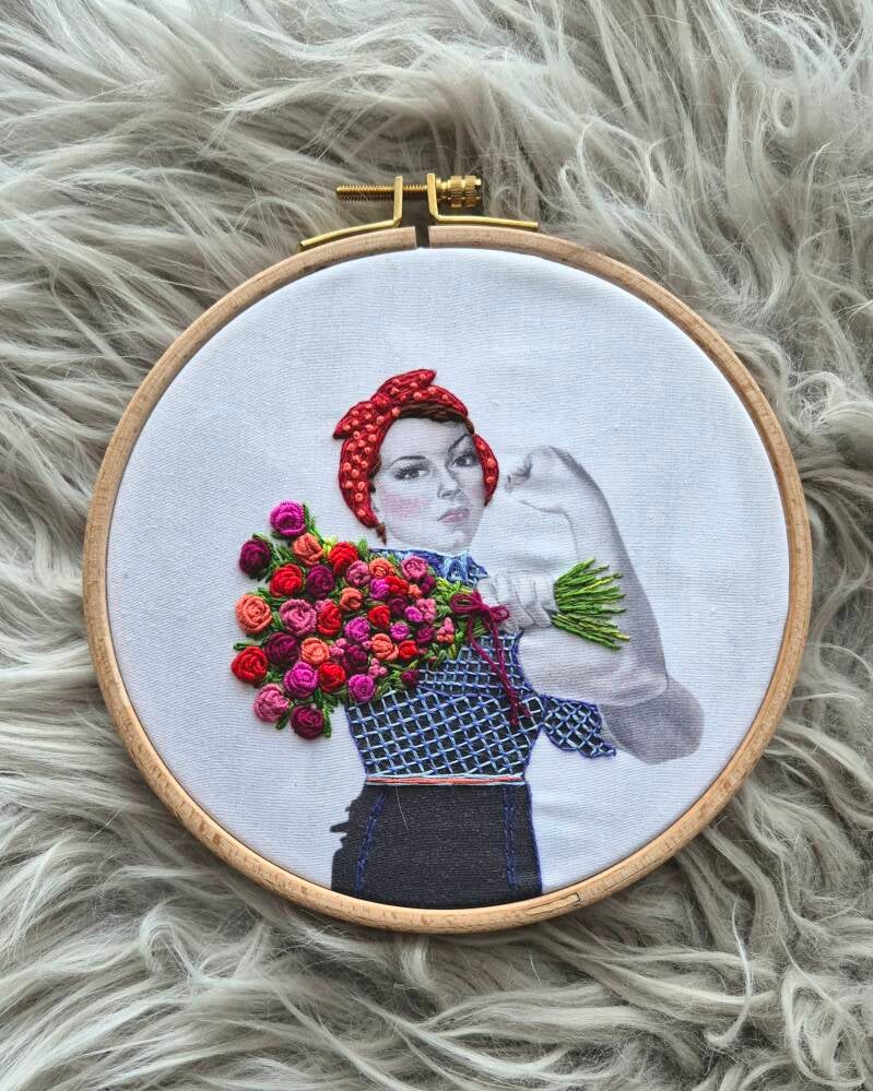 In deze workshop borduur je een kleurrijk boeket bloemen op een afbeelding in zwart/wit van Rosie the Riveter. Je kunt verschillende borduursteken oefenen op de borduurmandala die ik heb ontworpen.