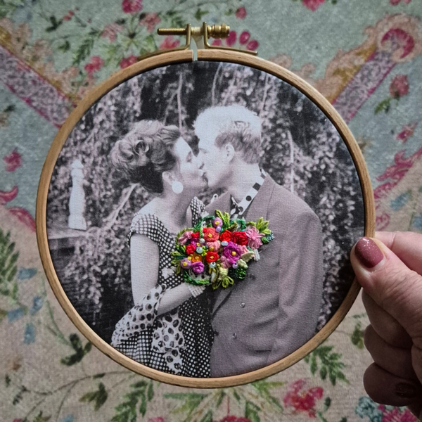 ๐ฉท Voor deze workshop kun je een eigen foto aanleveren of kiezen voor een Flower Rosie of een Lady K. (zie de laatste 2 foto's). De foto's druk ik af in zwart/wit op stof.